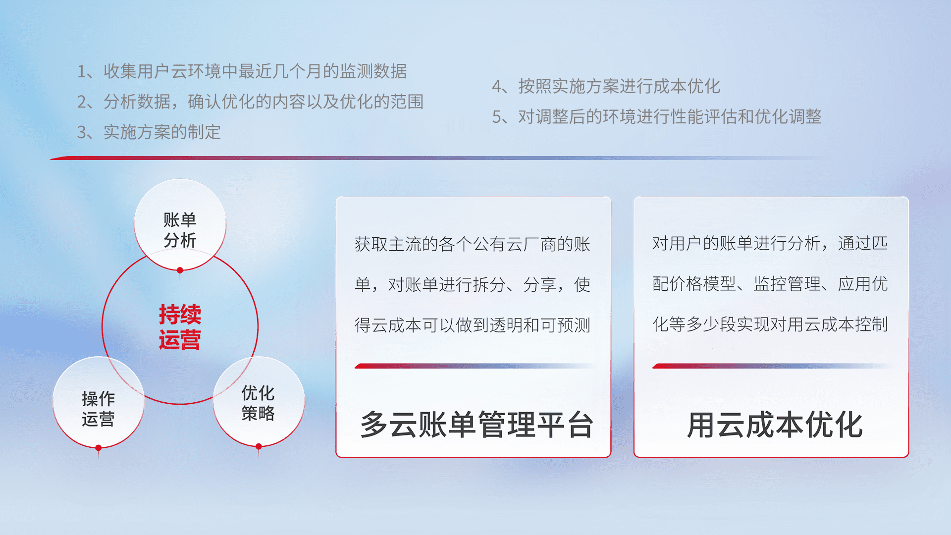 通过多云纳管,,,,以统一的资源数据模型把客户的云资源进行抽象和封装,,,进而实现对多云资源的统一操作,,保障云资源管理的可靠性、、、、稳定性与可用性。。。量身定制化运维内容,,,,配置、、、、开发运维、、、、补丁管理、、、备份、、、监控、、、、认证和访问管理、、、、审计和日常巡检等,,,,保障在用云过程中的可靠度,,稳定度以及高可用率。。。